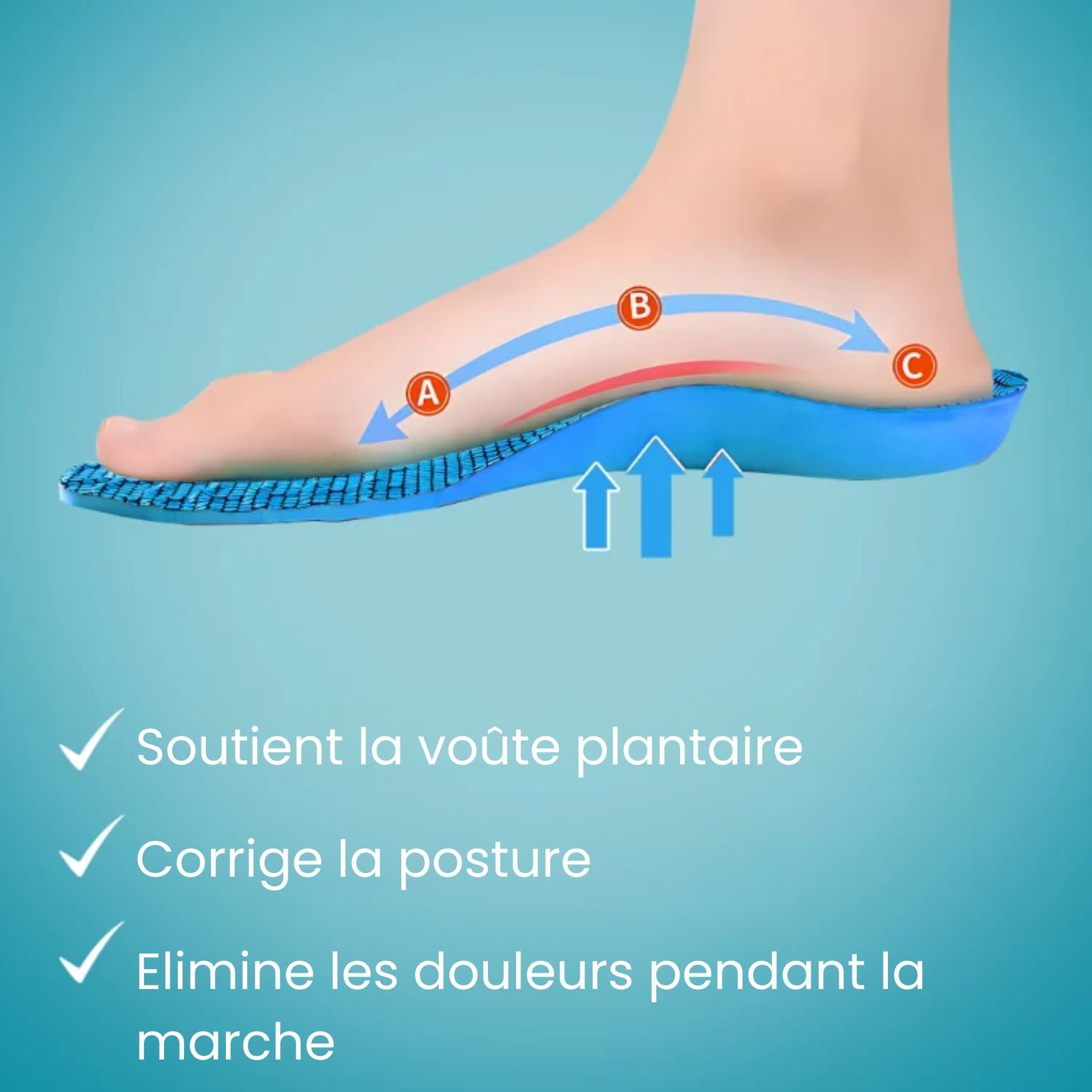 Leur conception unique combine un coussin de talon pour soulager l'inconfort, un support de voûte plantaire pour restaurer la position naturelle du pied, et un coussin métatarsien pour absorber les chocs.