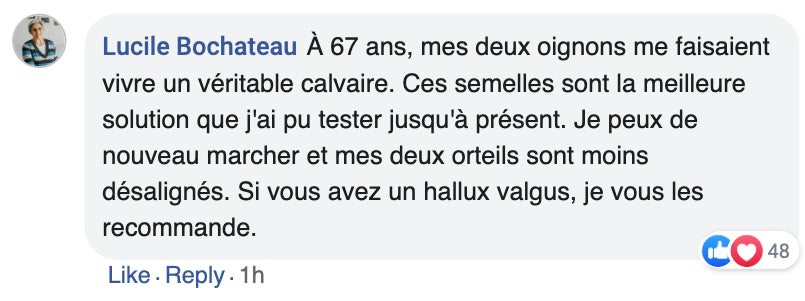 • À 63 ans, j’avais peur de devoir subir une intervention pour mes oignons, mais ces semelles m'ont vraiment soulagé. Elles m’aident à stabiliser mes pieds et à réduire la douleur. Et comparé aux correcteurs d'orteils, elles ne sont pas douloureuses et on peut les porter toute la journée."